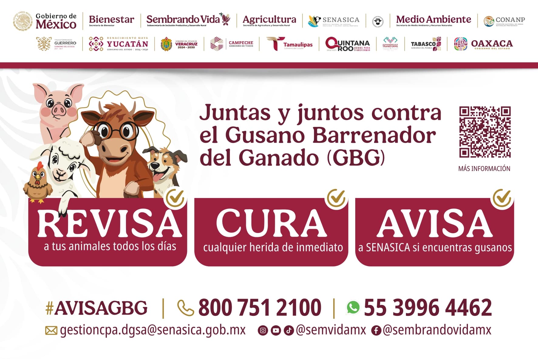 Hacemos un llamado a todas y todos los ganaderos a revisar diariamente a sus animales, curar de inmediato cualquier herida y dar aviso oportuno a SENASICA en caso de detectar la presencia de gusanos. La atención temprana es fundamental para evitar la propagación y proteger nuestro patrimonio.